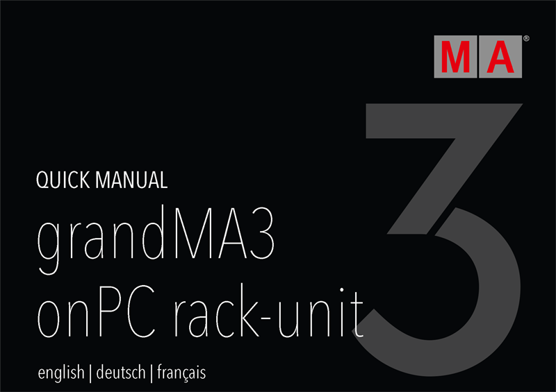 grandMA3 User Manual Publication grandMA3 Quick Manual onPC rack-unit grandMA3 Quick Manual onPC rack-unit Sub topicsIntended UseSafetySupportTransportLimitationsQuick StartMaintenanceDisposalTechnical DataHardware-related InstancesDeclaration of Conformity