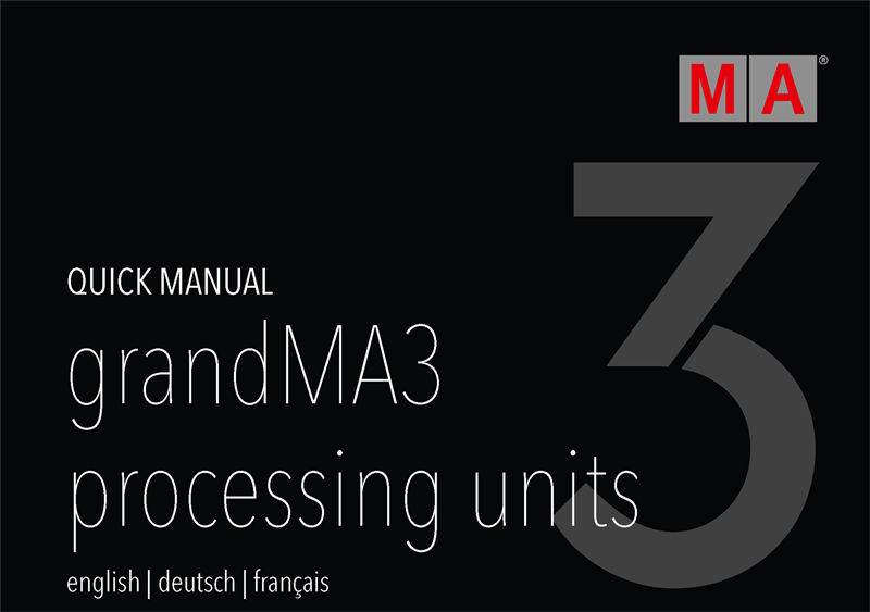 grandMA3 User Manual Publication grandMA3 Quick Manual Processing Units grandMA3 Quick Manual Processing Units Sub topicsIntended UseSafetySupportTransportLimitationsQuick StartMaintenanceDisposalTechnical DataHardware-related InstancesDeclaration of Conformity