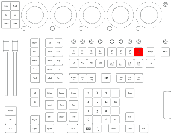 Pressing and holding MA + X8 | DMX enters the DMXUniverse keyword into the command line.
