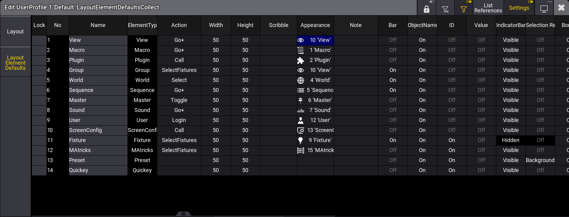 To use a custom appearance for layout elements, two finger tap in the Appeareance column and select a new one.
