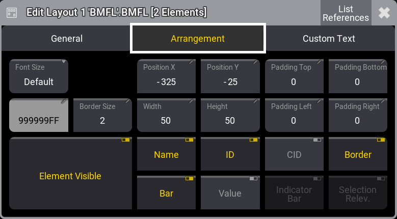 - Name, ID, CID, Boarder, Bar, and Value: Toggle to display or hide the name, the fixture ID, the custom ID, the dimmer bar, the output value, and the border of the layout element.