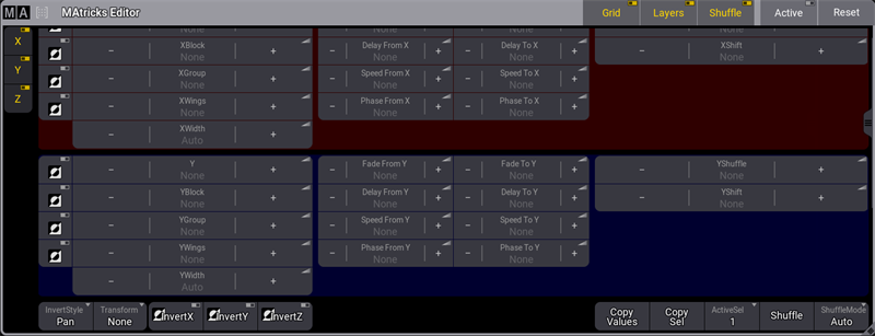 Each shuffle setting per axis can be set to 0 (=None) up to 32 767. Each value represents a different shuffled selection order. When repeatedly selecting the same amount of fixtures, the same shuffle value will result in the same shuffled selection order. This can be useful when a specific shuffled selection order is desired for the same number of fixtures. In this case, apply the same shuffle value in the MAtricks when the same number of fixtures are selected. The fixtures are then shuffled the same way.