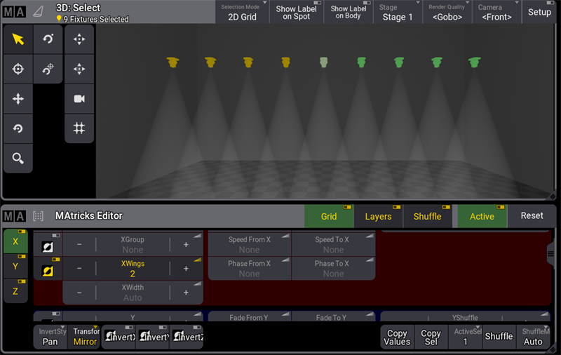 - Selected Fixtures with enabled Transform Mirror setting are colored in green.