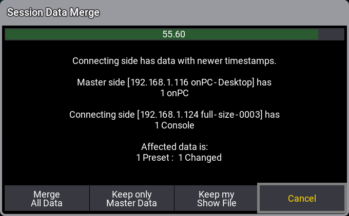 The changes in the show file data of the connecting devices are ignored. The show file of the Master side is maintained. Before overriding the show file of the connecting devices, the show file will be saved automatically on the connecting stations. - Keep my Show File: