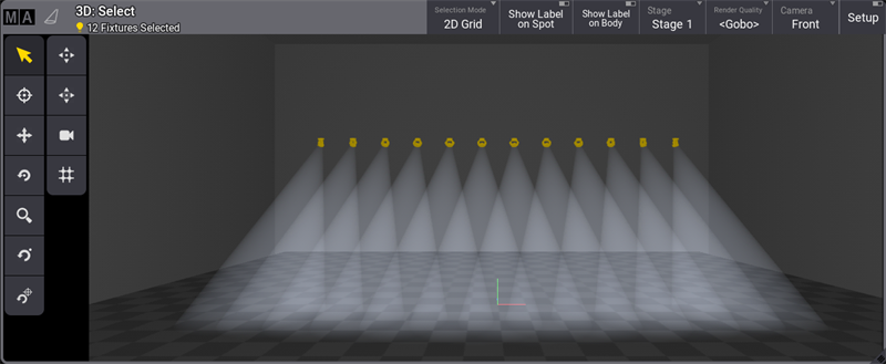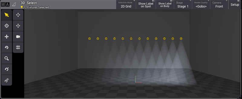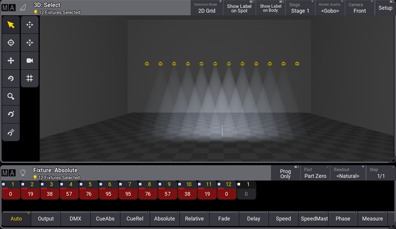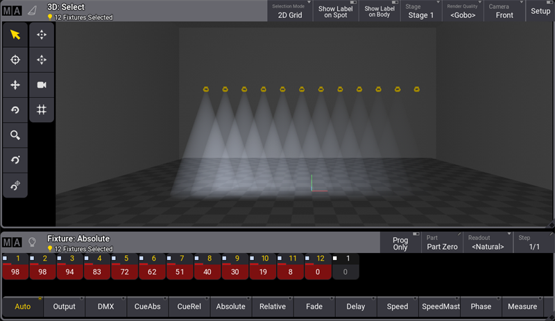 For the following examples, fixtures 1 thru 12 were patched from left to right. For more information, see Patch and Fixtures Setup.
