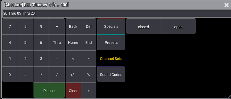 Tap the encoder belonging to the attribute that shall be aligned, and the calculator appears. It is now possible to enter the align values like the example below.