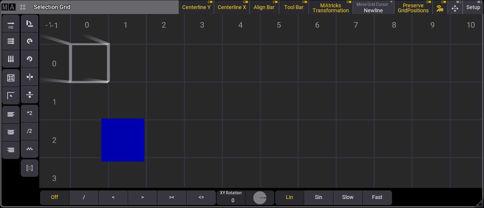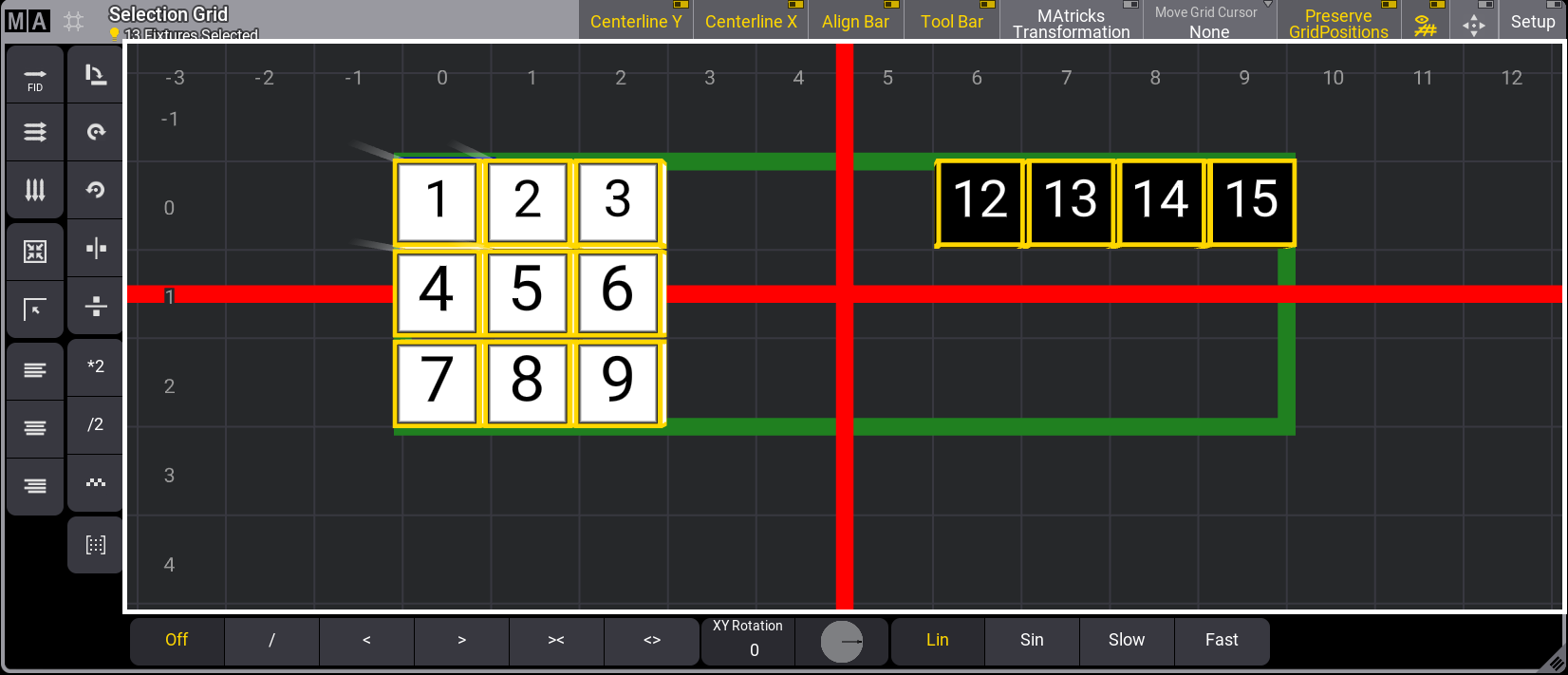 The grid organizes the fixtures in relation to each other but not necessarily their position in the 3D Viewer. A helpful tool for positioning fixtures in the selection grid according to their position in 3D space is called the 3D view to Selection Grid. For more information about this tool, see 3D Viewer.
