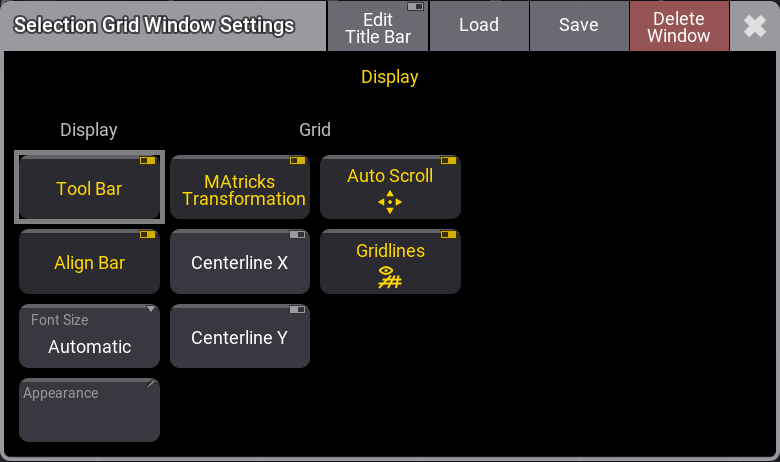 Tap the MA logo on the left side of the Selection Grid window's title bar to open the Selection Grid Window Settings.