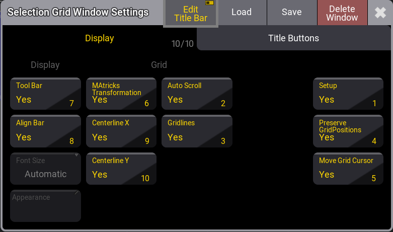 To display or hide buttons from the Selection Grid window Title bar, tap Edit Title Bar in the Selection Grid Window Setings title bar: