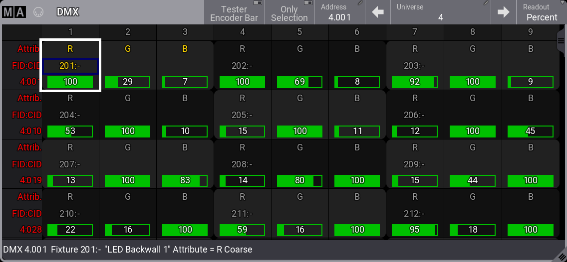 In the example above, some RGB LED fixtures are patched. The selected fixture (FID 201) gets a yellow text color in attributes and FID:CID.