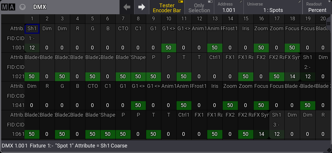 It can also be done using the DMX Tester encoder bar. It can be shown by turning on the Tester Encoder Bar in the title bar of the DMX Sheet.