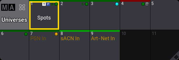 If a universe is assigned to a DMX port, there is a small port icon. This can have different colors depending on whether the port is set to output (green), input (orange), output and input (bright cyan), if it is output with RDM enabled (dark cyan), or if it does not output DMX (black).