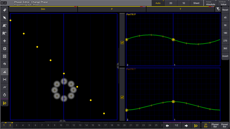 The Change Phase part of the phaser editor represents each fixture as a yellow dot in a grid where the horizontal axis is the phase value.