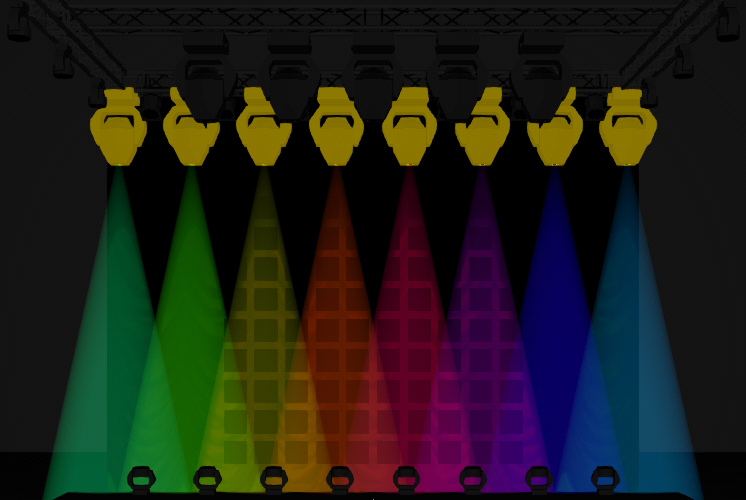 All the fixtures now change color together through the rainbow colors. If this is the desired result then store this in a cue or preset.