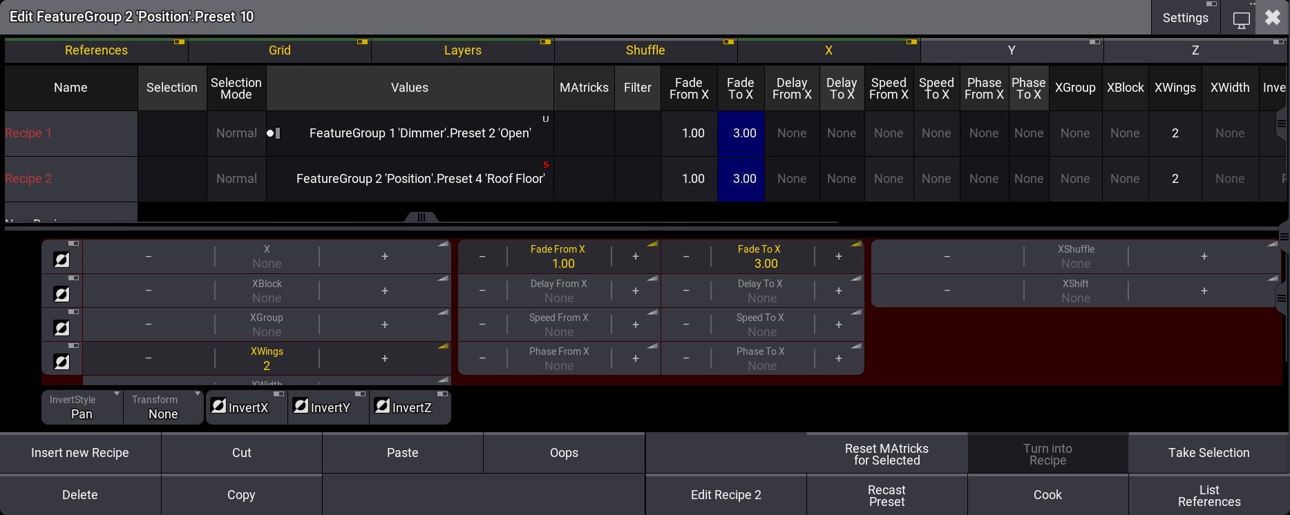 This recipe works with the programmers' current selection of fixtures. The recipe preset is not loaded into the programmer. Instead, the recipe value links and grid values are used with the current selection of fixtures to cook values directly to the programmer.