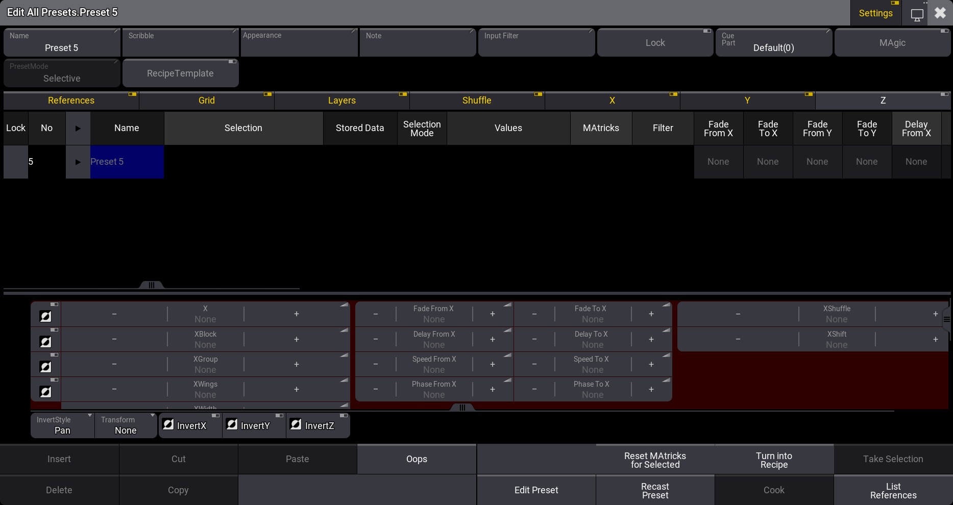 For example, if a recipe preset contains one line with a group as the selection and a value referencing color preset 5. The preset is cooked in the preset. Tapping the recipe preset will result in a reference to the recipe preset in the programmer.