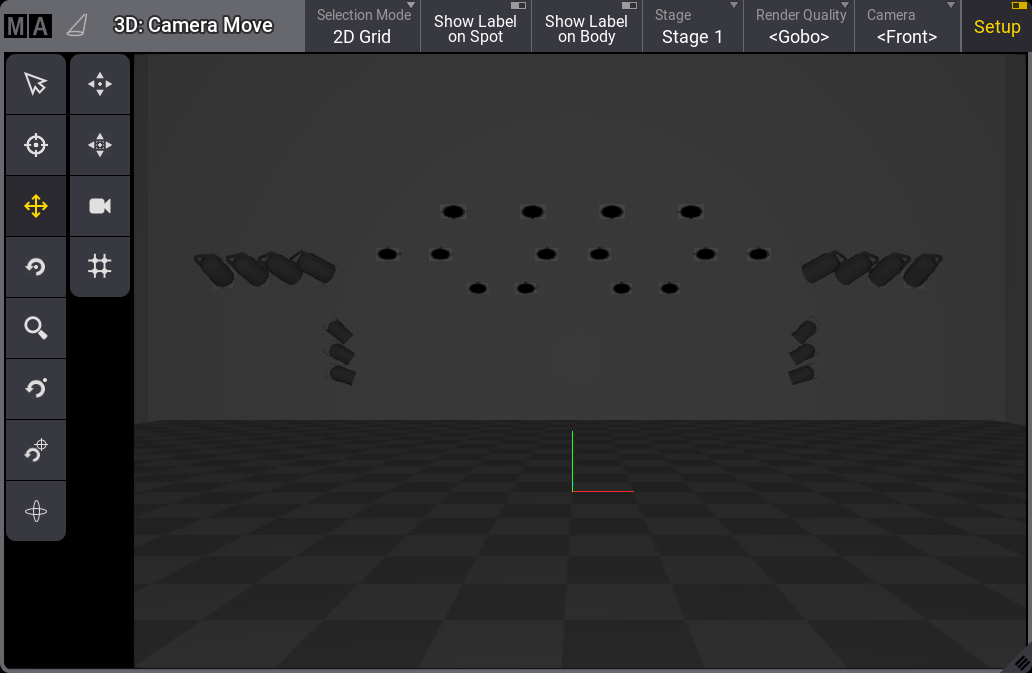 When the fixtures are patched, they are positioned at the zero position. This is where we see a green and red line in the image above. It is on the floor in the middle of the stage area as a default.