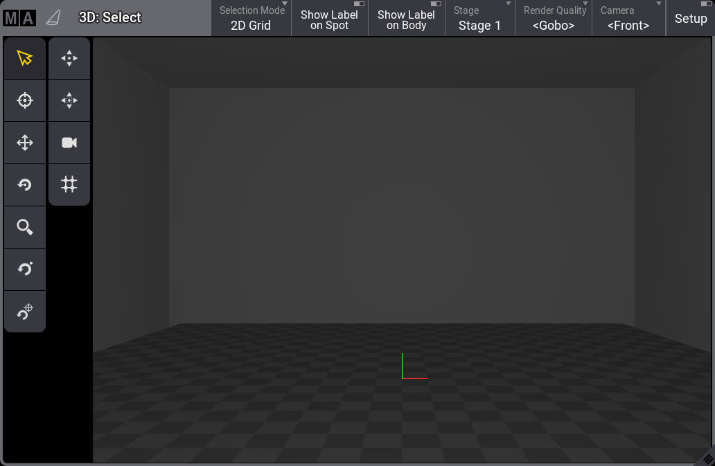 We are looking at the stage area through a virtual camera. There are several default cameras, but for now, we are just gonna use the one called Front. You can see the camera we use in the 'Camera' button in the title bar.