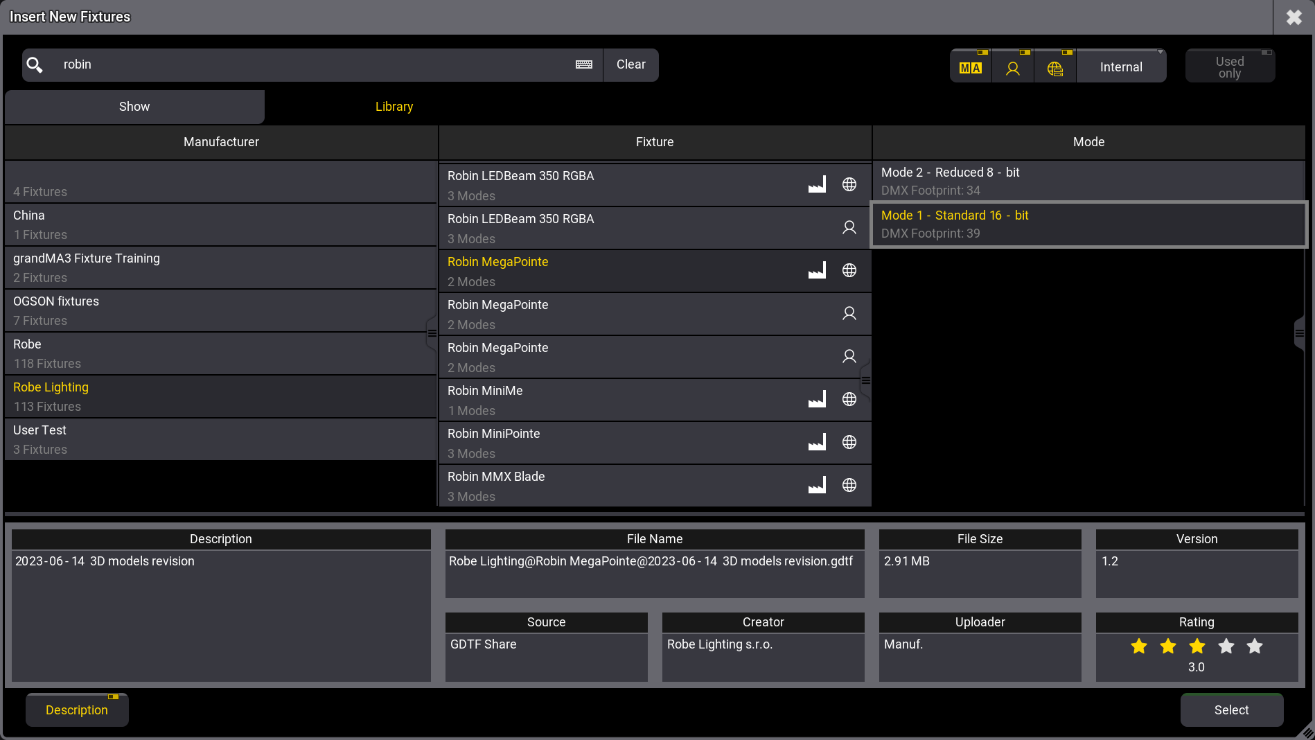 Notice in the image above that the manufacturer has uploaded their fixtures under the Manufacturer name "Robe Lighting". These are the fixtures we need.