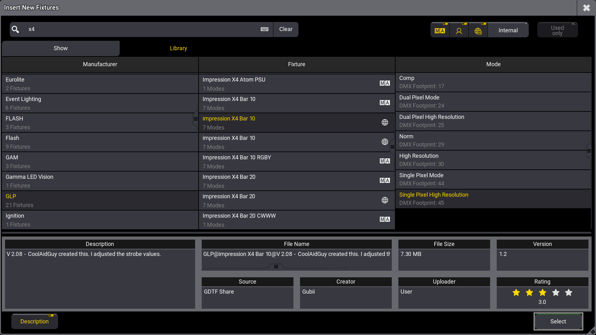 We want to import an "Impression X4 Bar 10" fixture from GLP in a "Single Pixel High Resolution" mode.