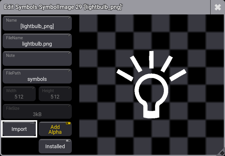 Click the Import button in the pop-up. This opens another pop-up called Select Image for Import. You can scroll through the library, or in the Filter you can write lightbulb. We want the symbol called "lightbulb.png". Select it and click Import.
