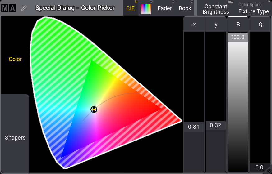 The left side of thee window has two vertical tabs called "Color" and "Shapers". Shapers are used with fixtures that have motorized beam shaper functions. None of our fixtures have this, so we are just going to look at the color tab.
