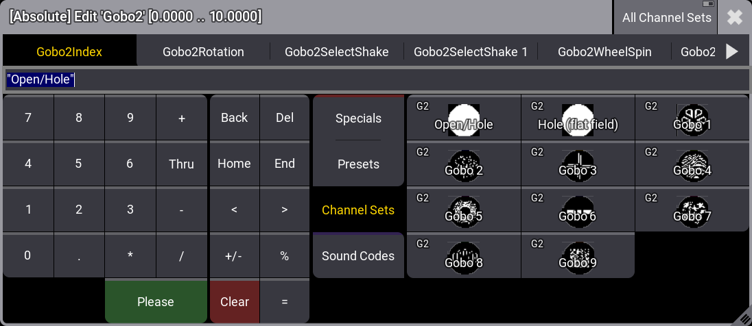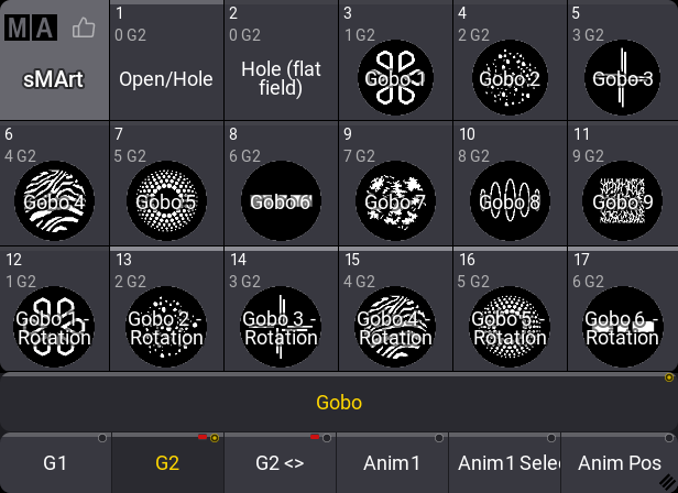 This gives access to the defined channel sets by a dynamic pool that changes content based on the selected feature ("Gobo" is the feature in the example above).