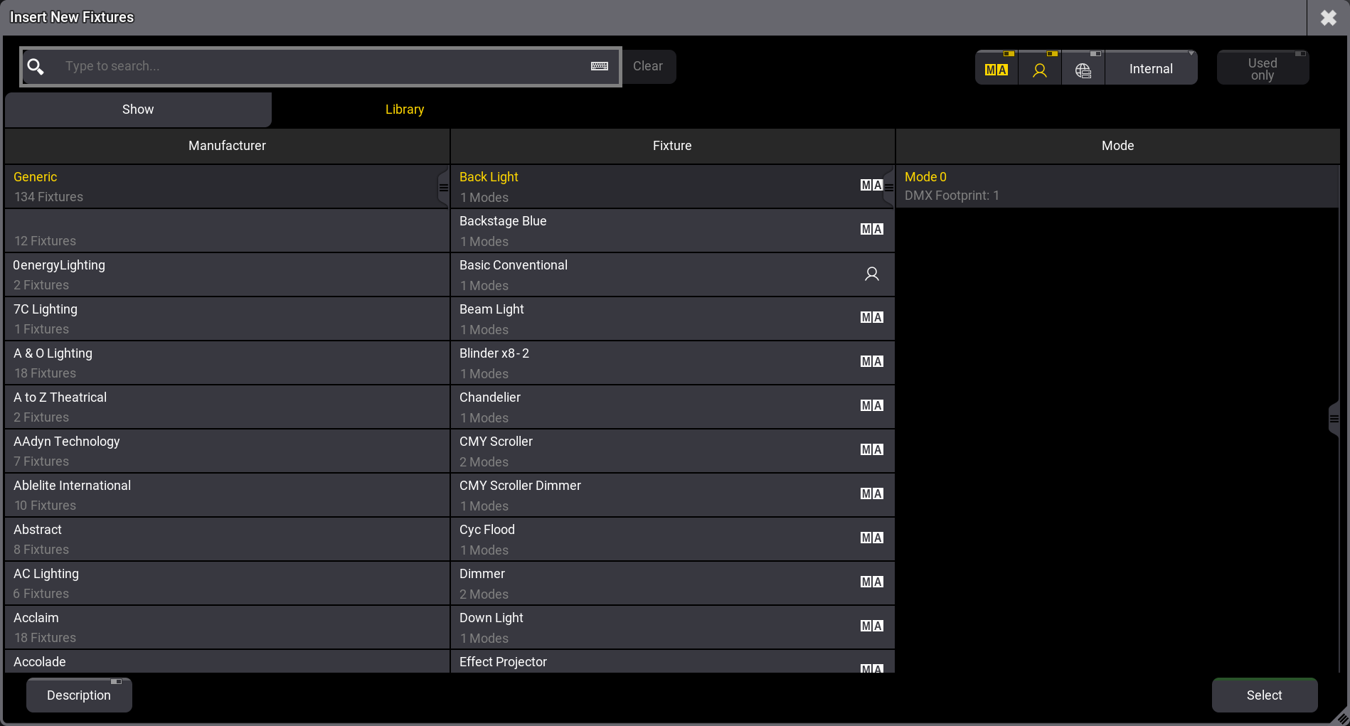 The list is the library. The default is the MA and user fixtures on the local hard drive (Internal). Other libraries can be chosen, but this is fine for the first fixtures.