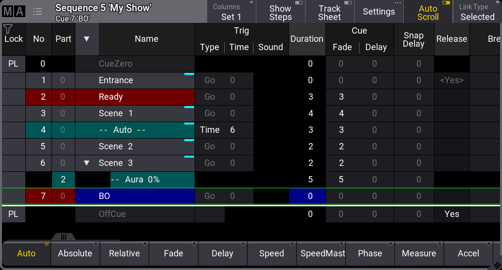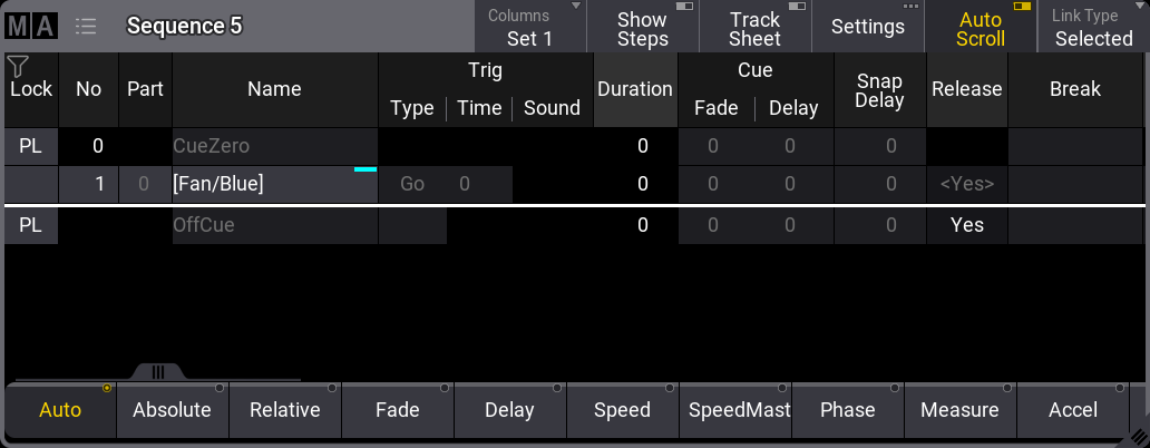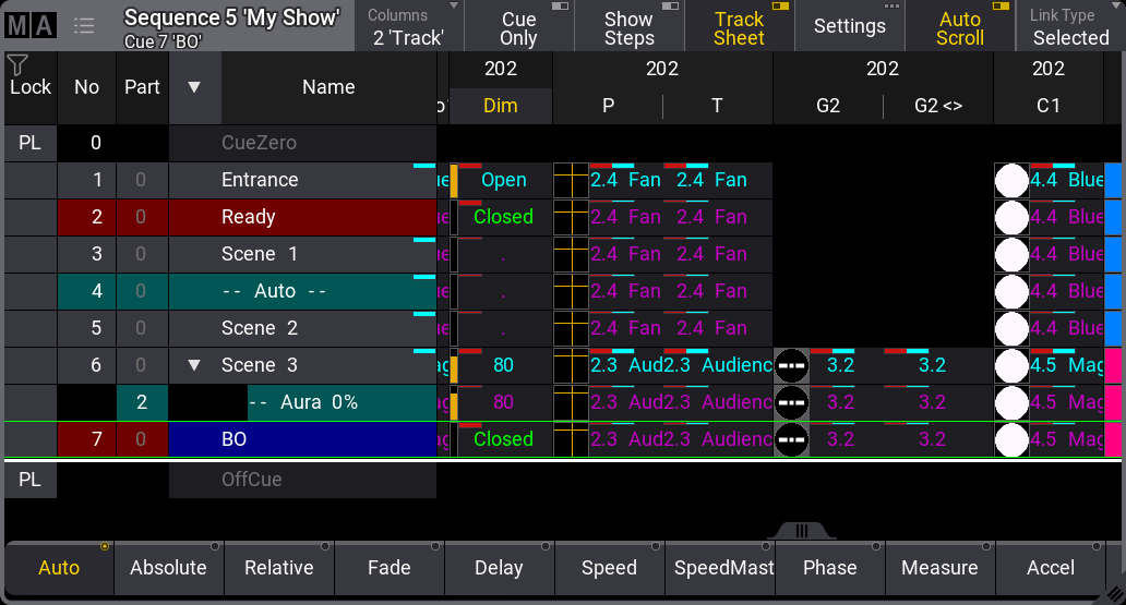 We can see what is stored in the cues by changing the sequence sheet into a tracking sheet.