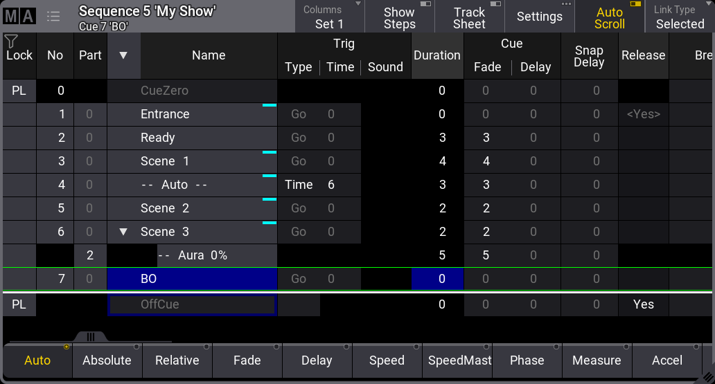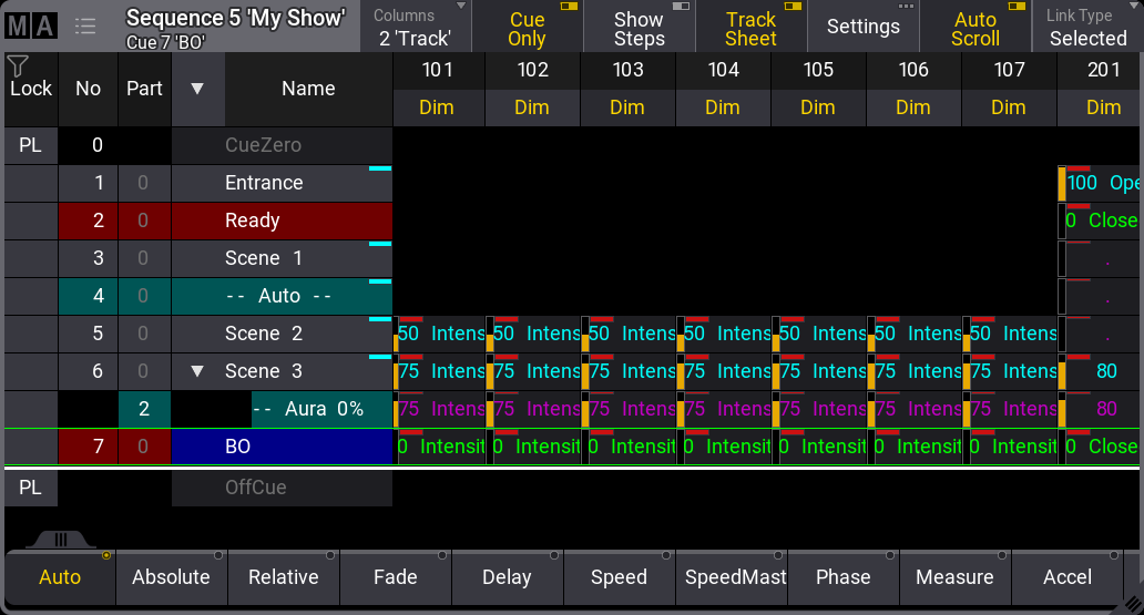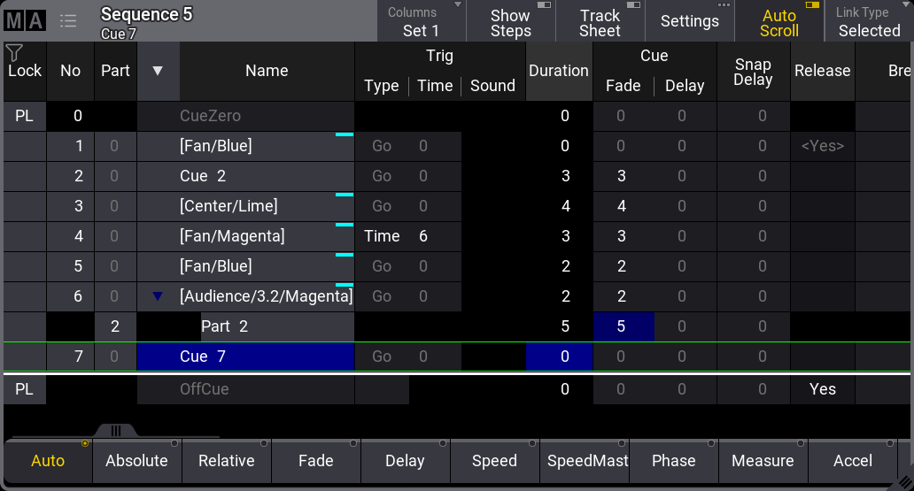 With cue 6, we created a cue where the Mega Pointes turn On, and the Auras turn Off. We know this because we just did it. If we return to this show after some time has passed, we might not remember that the Auras use the outfade time. So let us change this to a different solution that makes it more obvious what is happening. We are going to create a part cue with the Auras.