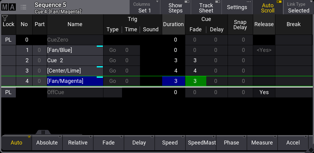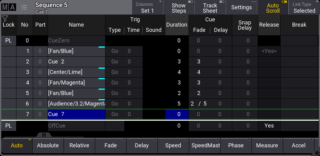 We also specified two different numbers separated by a forward slash. This means that the cue now has fade and outfade times. The outfade time (5 seconds) will be used by the dimmer going down in value (the Auras). All other attributes change values using the normal fade time (2 seconds).