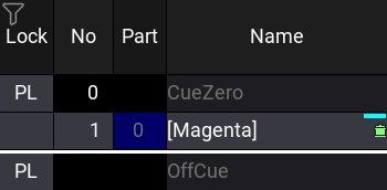 We can see that the fixtures get the color from the preset cooked into the cue, and the dimmer values are stored directly into the cue without referencing a preset or a recipe. Turn on Track Sheet to see what is stored in the cue. It appears that the color is just coming from the preset, just like if we stored it manually into the cue. Only the small green dot in the upper right corner of the value and the pot icon in the name indicate that some attributes are affected by a recipe.