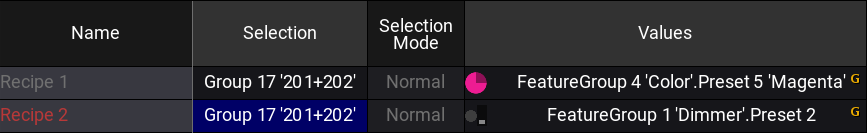 This gives us the first recipe line where we can assign a "selection" and a "value". Please use the same group we use in the cues and select a color preset as the value.
