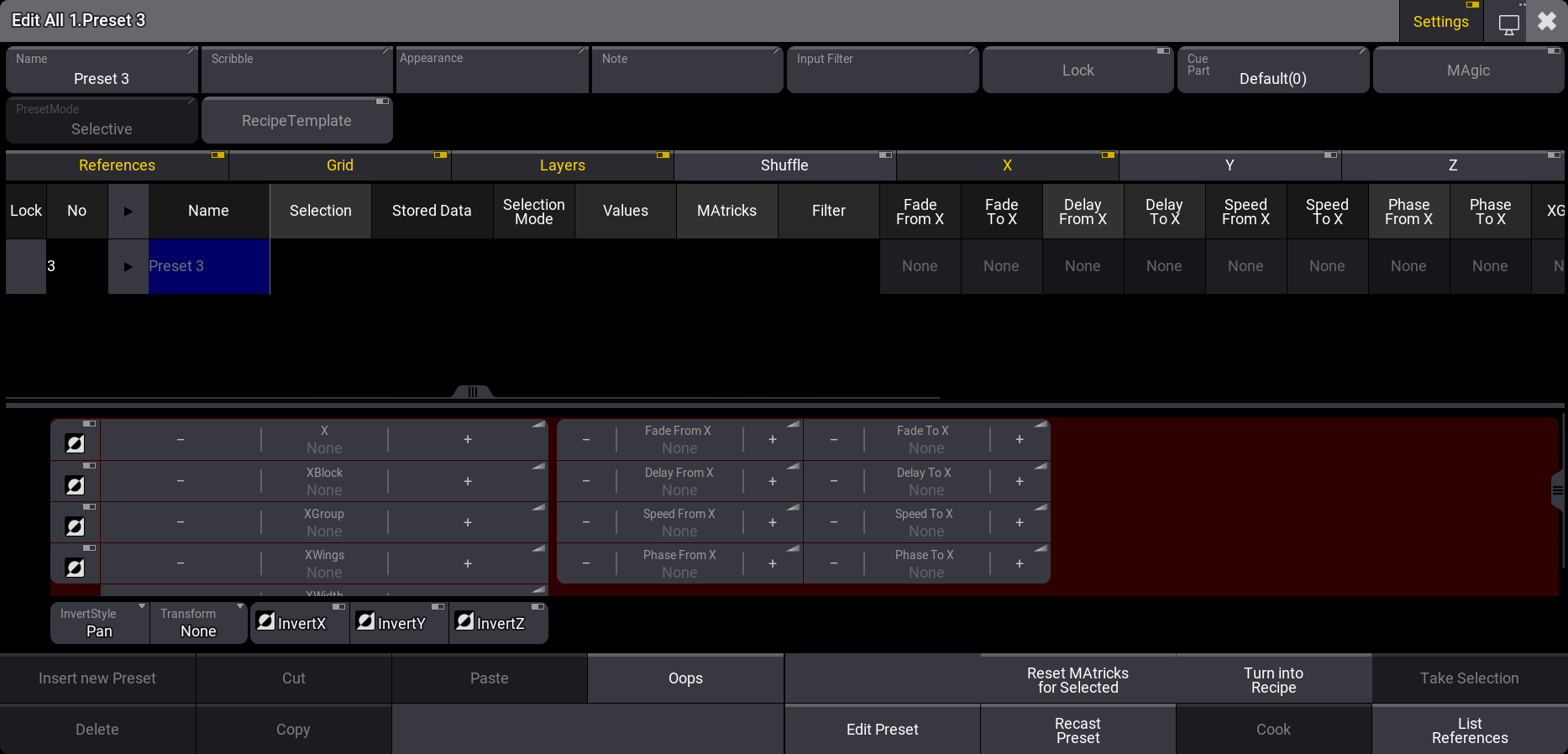 Preset like this can be used in busking and playing back values on the fly. Changing the group or preset content updates what is called with the preset. Try selecting group 7 again (all the Mega Pointes) and store the selection on the group used in the recipe (Group 17).