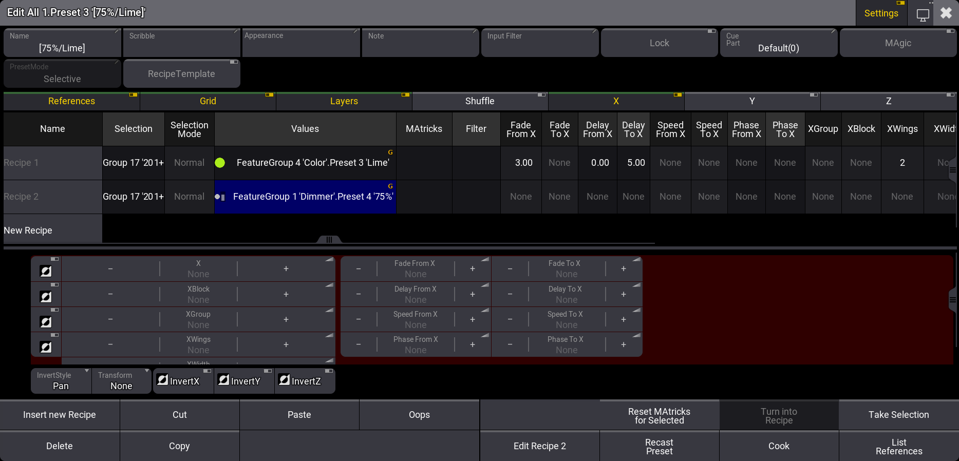 Recipes are explained in more detail in the Recipes topic. Using recipes in cues is explained in the Cue Recipes topic. Using them in presets is described in the Recipe Presets topic.