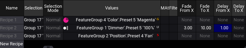 Scroll the recipe to the right to show the four "Fade" and "Delay" columns.