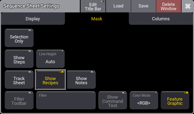 We need to edit the sequence sheet to show us the recipe lines. Click the MA logo in the upper left corner of the sheet, then click the Mask tab. This tab has settings for adjusting how the sequence sheet looks. Click Show Recipes to toggle it On.