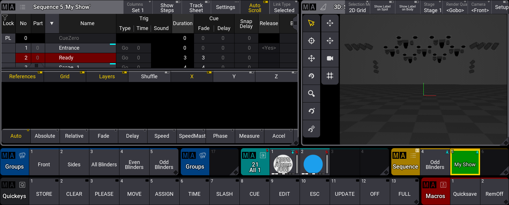 Run the first cue of the sequence. We don't see anything. Select the group and give the fixtures a dimmer value. Store this into cue 1 using merge and clear the programmer.