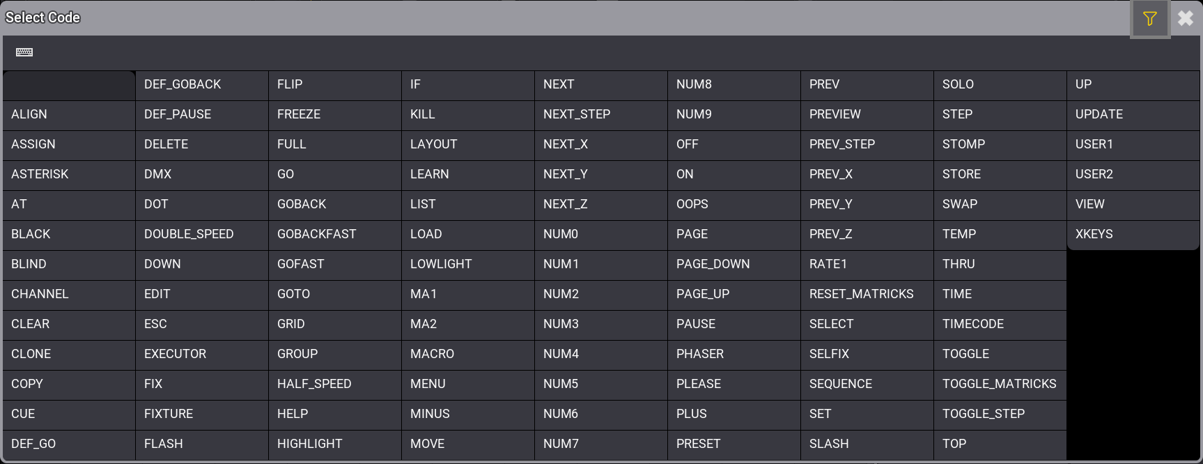 Tapping Code in the pool editor opens the Quickey code list. To filter codes, tap