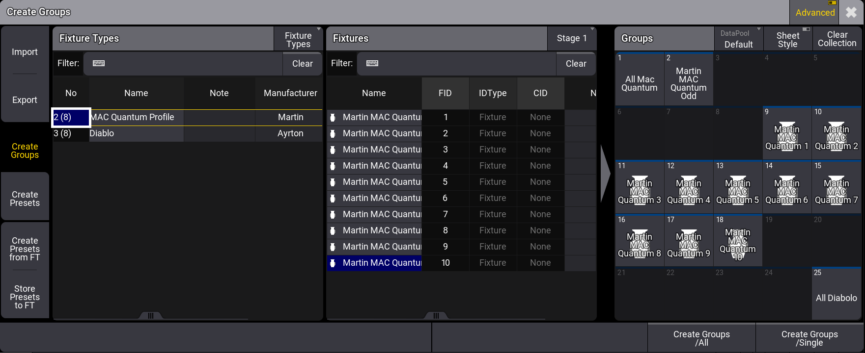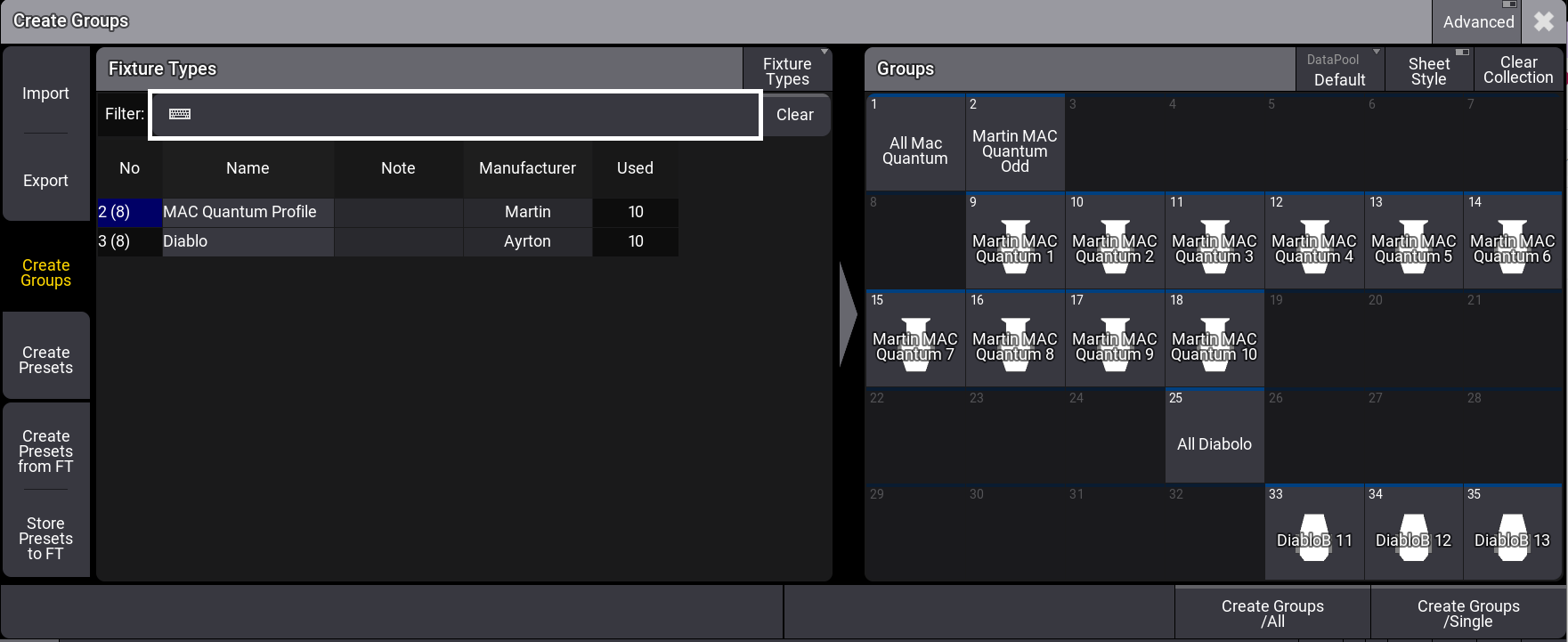 When tapping Advanced on the Create Groups title bar, a center area appears. It allows the creation of groups based on a reduced set of fixtures.