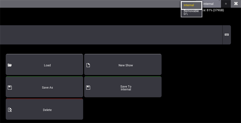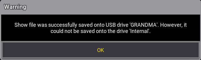 | Saving a show file to an external drive automatically saves a show file to the internal drive. |