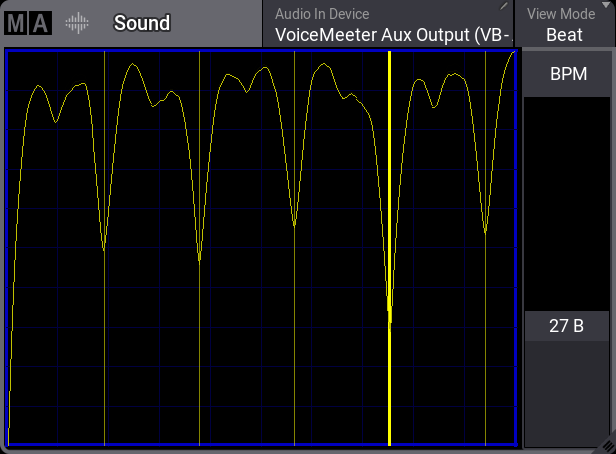 A bold, yellow, vertical line appears when the BPM master locks onto a beat. The BPM master adjusts automatically to follow any changes detected in the incoming signal.