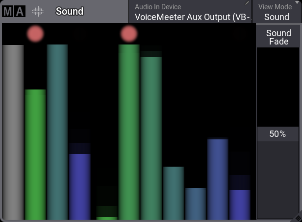 The Sound view mode of the Sound Viewer displays the incoming audio signal as a series of bars representing the volume of different bands of frequencies. When a given bar reaches a peak, a dot appears above the bar. This dot represents a possible sound trigger based on that frequency band.