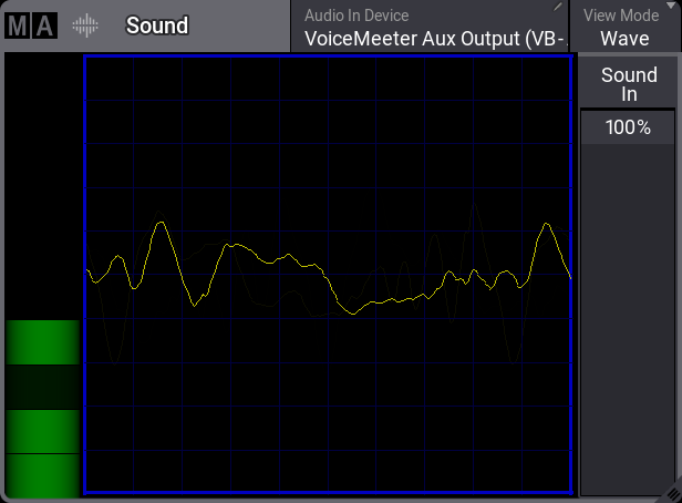 The right side of the window includes quick access to the Sound In master. Adjusting the Sound In master changes the volume of the input signal. This change is immediately visible in both the VU meter and the waveform. For more information about the Sound In master, see the Grand Masters topic.