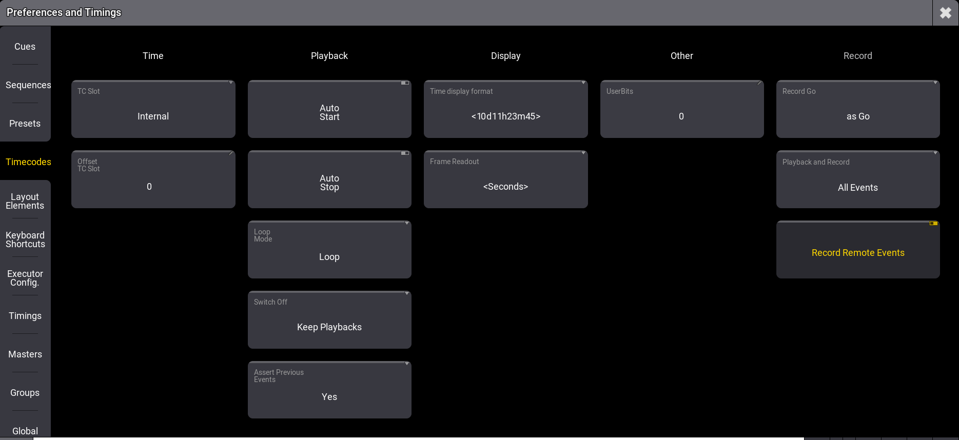 To define which user actions will be recorded, tap Global at the bottom left side of the Preferences and Timing window, then tap Timecode Events Recording from: