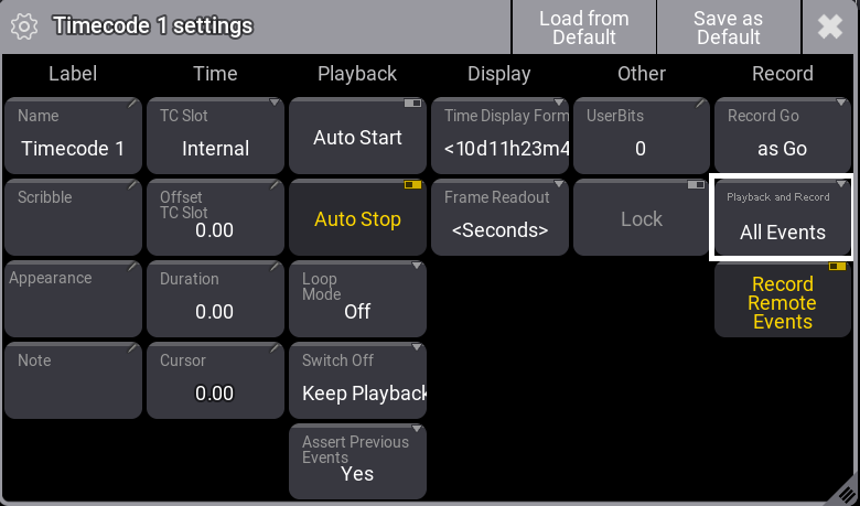 - Manual Events: Only actions the user triggers are recorded and played back. Follow cues, for example, are not recorded nor played back. Changes made to commands in cues after the timecode show was recorded are respected when playing back the timecode show. This is the default value for Playback and Record.