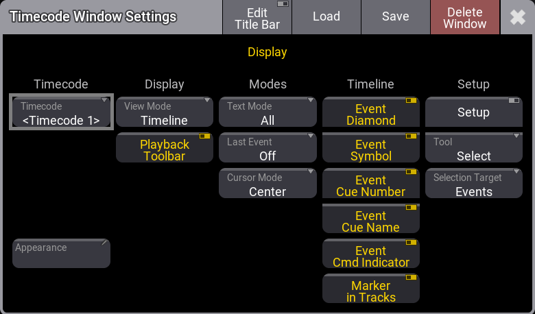Tap the Display tab, then tap a button to toggle its visibility in the Timecode Viewer window's title bar.