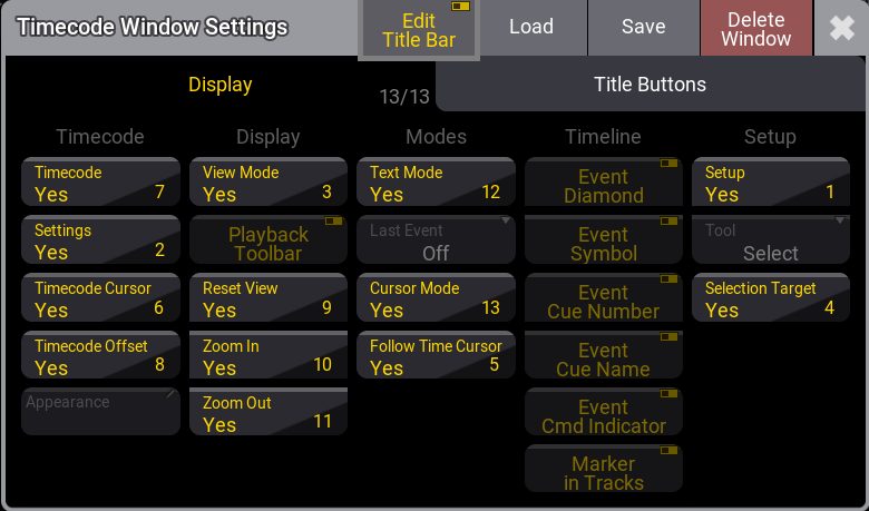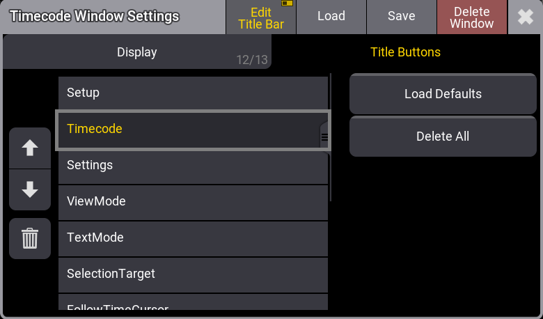 Tap the Title Buttons tab to arrange the order and visibility of the buttons in the Timecode Viewer window's title bar: