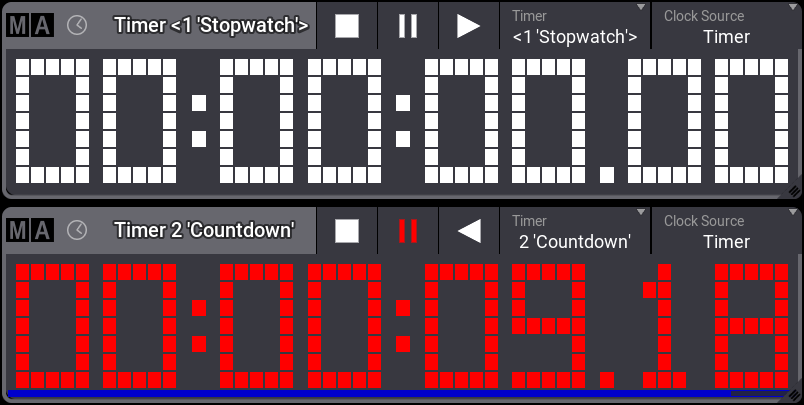 A timer can be paused in its running. This keeps the current time on the timer. Restarting the timer with a Go+ command can either restart the timer or let it continue. This can be set in the setting for the timer.