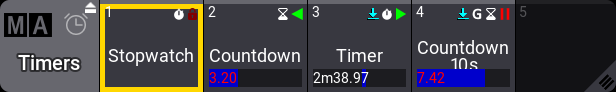 A timer can be started with a Go+ command or toggled On if it is Off or paused. It will start to count up or down in real-time.
